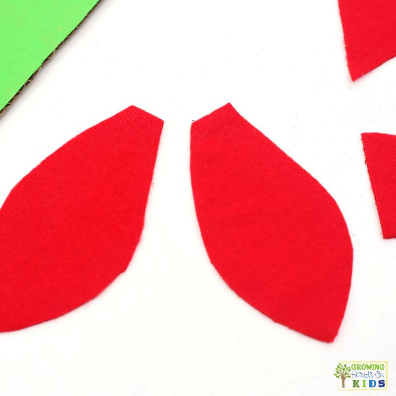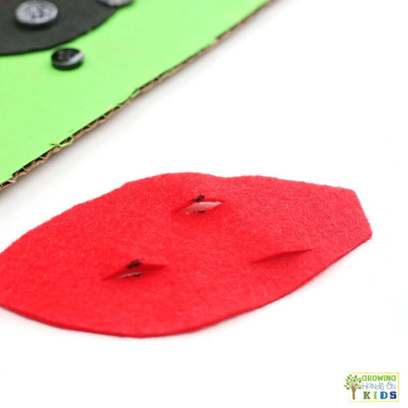 Cut out two red wing shapes from felt. Do not glue them down. - Place the buttons