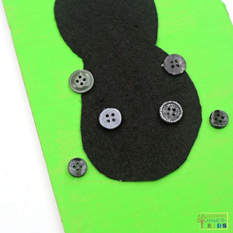 Glue black buttons directly onto the cardboard and felt where the wings will lie. Space them out so kids have multiple threading spots. - Thread the buttons