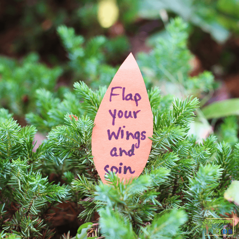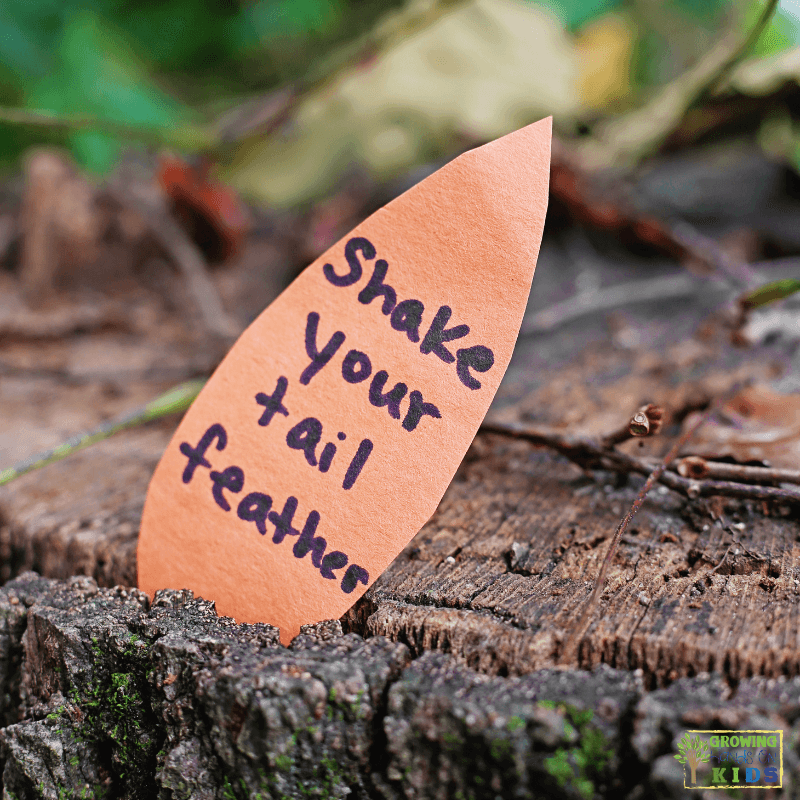 - Invite the kids to hunt for the feathers. When they find one, they read the prompt (or have it read to them) and act out the movement before searching for the next feather.